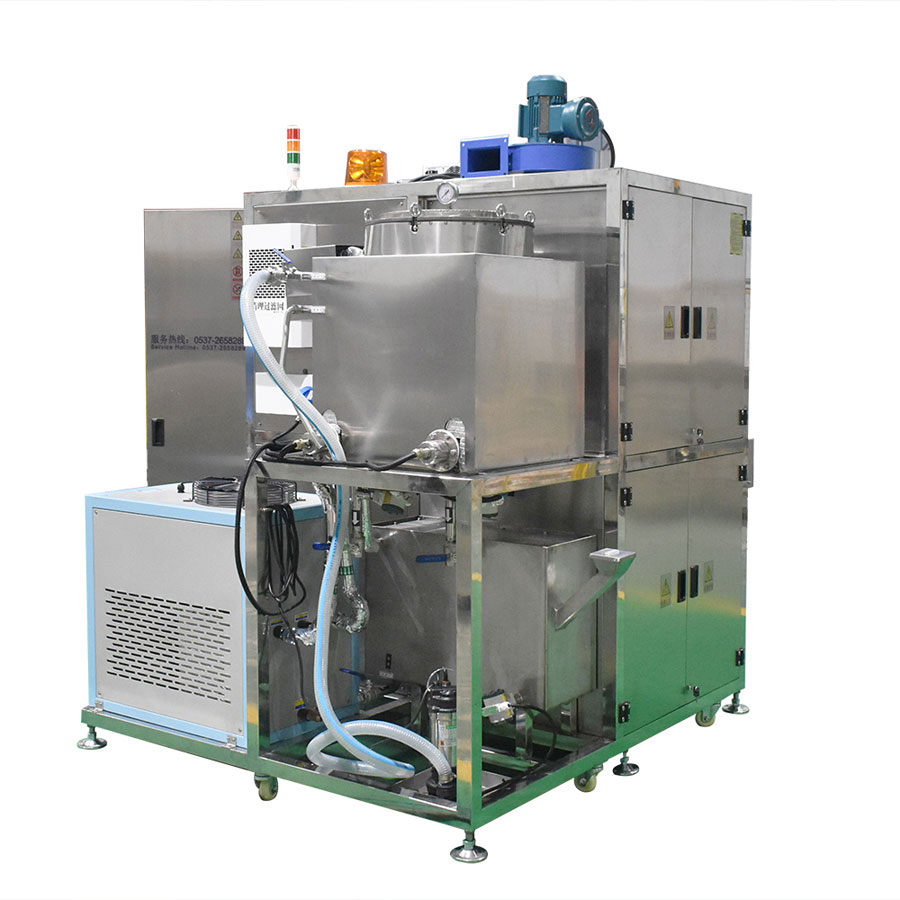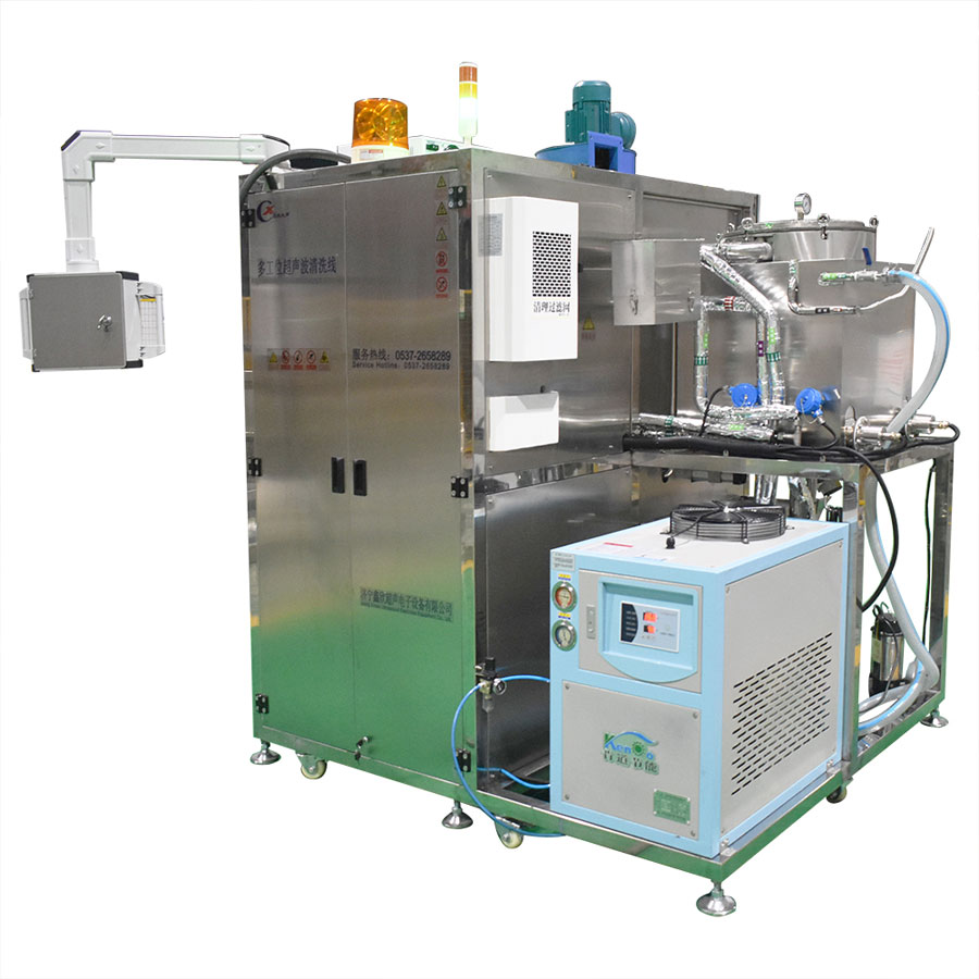 該設(shè)備為高潔凈度清洗機,采用碳?xì)涑暡ㄇ逑垂に嚒T撛O(shè)備由超聲波清洗槽、蒸汽浴洗槽、清洗網(wǎng)框、清洗槽冷凝區(qū)、分水器、工業(yè)冷水機、溶劑回收機、管路系統(tǒng)、智能控制系統(tǒng)等組成